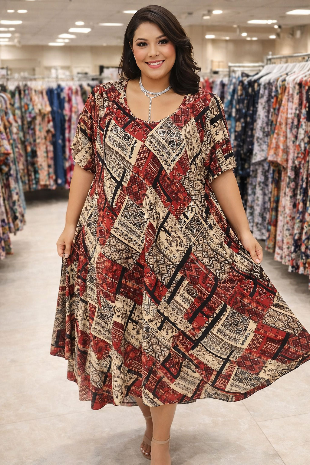 Rochie peste genunchi cu imprimeuri vibrante. Are decolteu pe rotund croi clos.