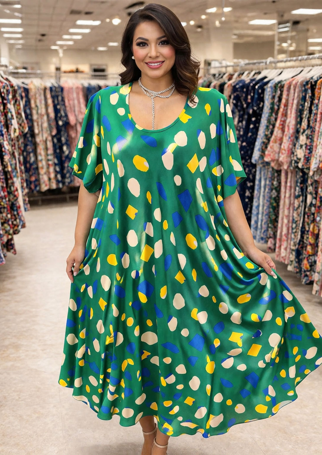 Rochie peste genunchi cu imprimeuri vibrante. Are decolteu pe rotund croi clos.