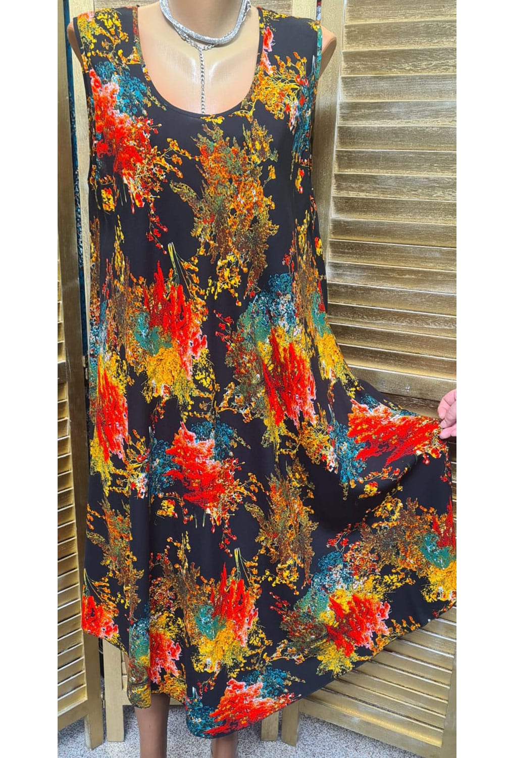Rochie fara maneci de vara, peste genunchi cu imprimeuri vibrante. Are decolteu pe rotund croi clos.